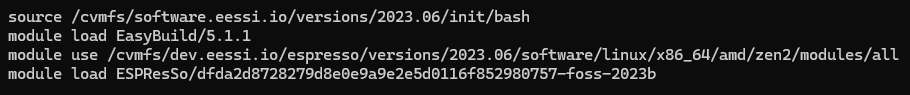 ESPResSo can be either compiled from sources using the instructions in the user manual [13] or loaded from the EESSI repository. Loading the latest version of ESPResSo from dev.eessi.io involves the following steps, assuming the workstation is equipped with an AMD microprocessor: